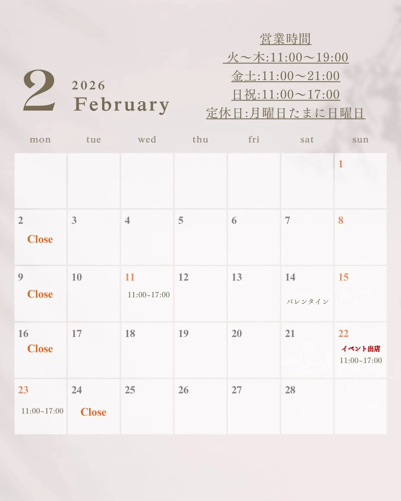 【2月営業日程】