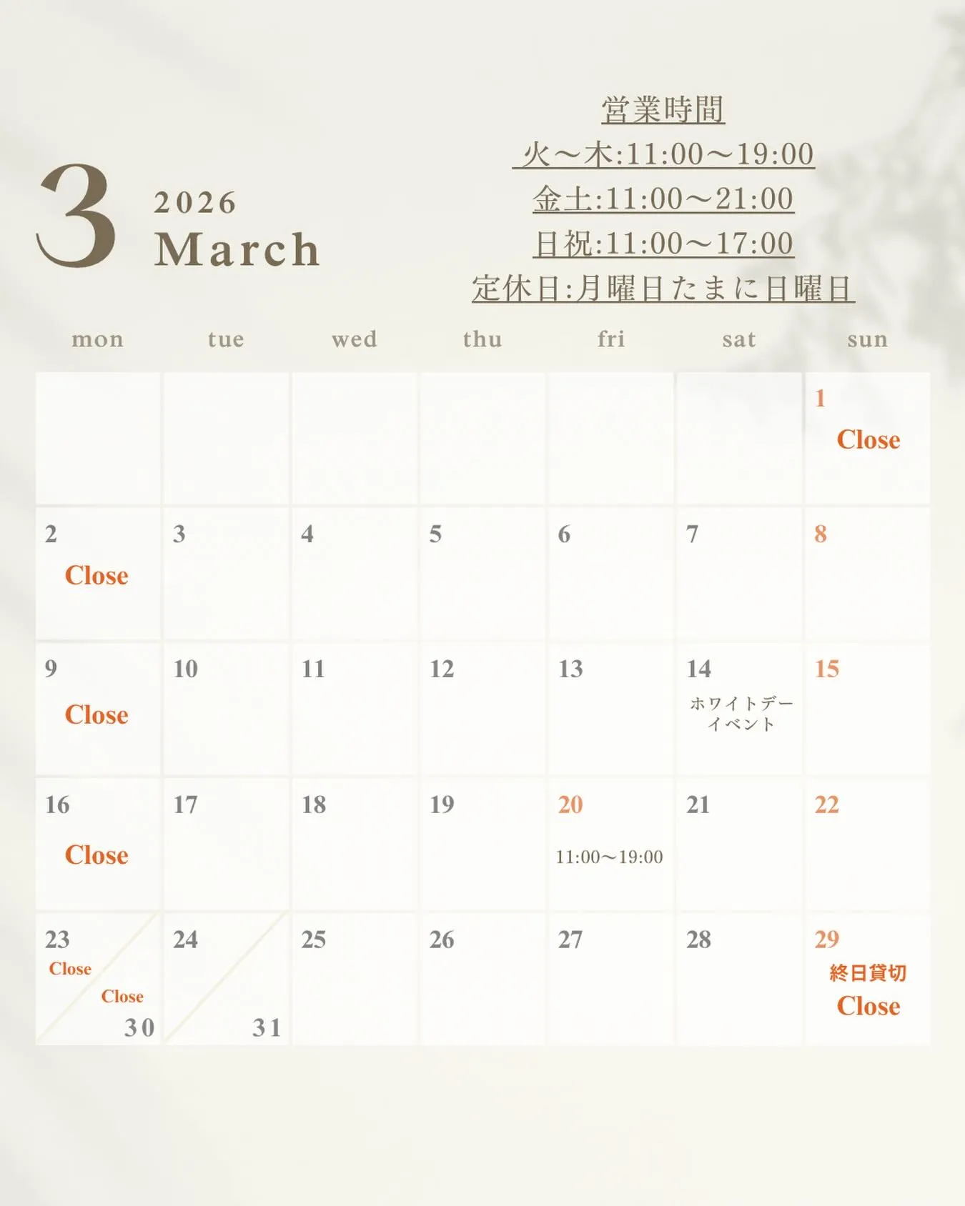 【3月営業日程】